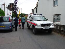 As with previous fete reviews, we start with the immortal line: "never rains on Longhope Fete day". The day dawned and didn't look too promising leaving us thinking: will it, won't it? However, it remained very cloudy and breezy for much of the day with a few spots of rain in the air. Heavy and dark skies threatened the village all afternoon. The procession was led through the village by the Drybrook Band, followed by the floats and walkers. Ian and Maureen Cameron, who over many years have made a very valuable contribution to the village, for which we would all like to thank them, opened the fete. The Playgroup was voted winners of the Best Float competition with "Gone to Nurseryland", with Hope Brook School coming a close second with "Heroes and Heroines". The Shreks were judged to be the best "Walkers". This year The Plantagenets gave a wonderful display of a mediaeval enactment, and were very popular. A very large crowd turned out, and a marvelous time was had by all, as our photos show, even the silly ones!